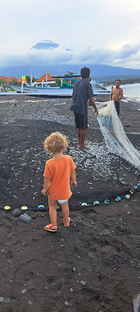 Hieman mietimme, miten skootteri ja Eido, siis paikallisten suosima tapa, koko perhe skootterin päällä, onnistuu. Alun totuttelun jälkeen ajelu alkoi luonnistua. Eikä Eido vaatinut edes sitä hetkeä. Hän oli innoissaan heti, kun pääsi kyytiin, kunnes nukahti 10 minuutin ajon jälkeen. Eikä kypäräkään tuottanut ongelmia. Sen jälkeen olemmekin skootteroineet useampaan otteeseen, ensin Lantalla ja sitten Balin Amedissa.